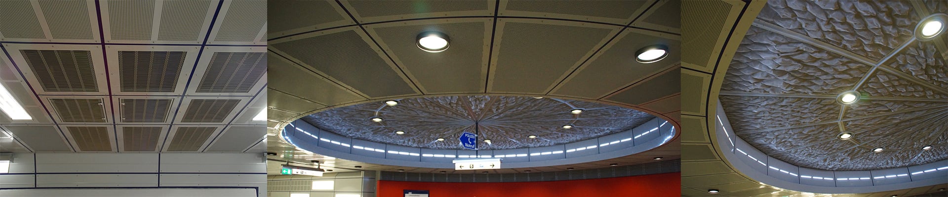 Three-dimensional, stainless-steel wire mesh ceiling MONTANA at a subway station in Cologne