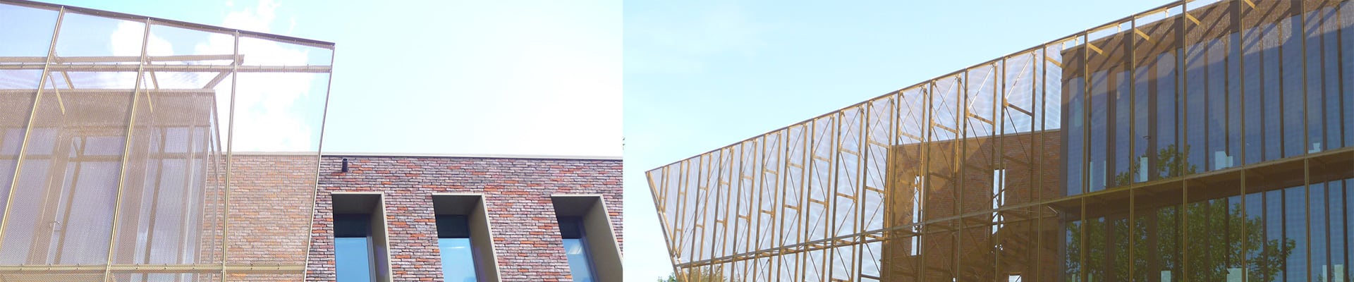 The mix of gold and copper colored wires, and the transparency of 66%, gives the façade its homogenous character and follows the aesthetic holistic of the building without significantly compromising the view from the inside through the windows.