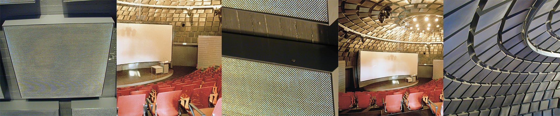 Single cassette panels, made of architectural wire mesh, form the ceiling and make the integration of acoustic panels possible.