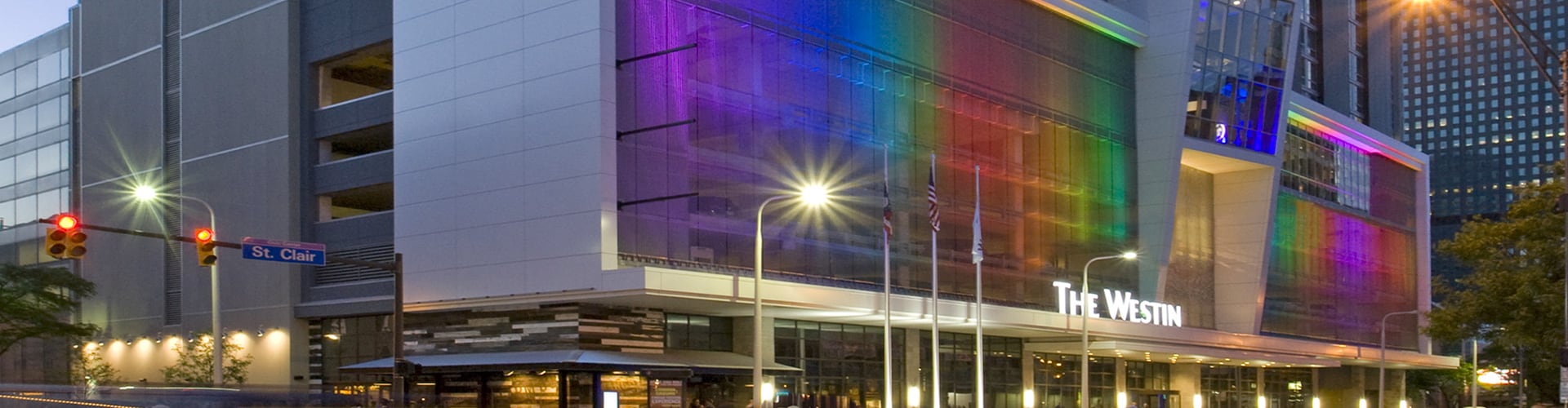 Illuminated architectural mesh provides a beautiful, transparent, stainless-steel façade by day and a vibrant veil of color by night.